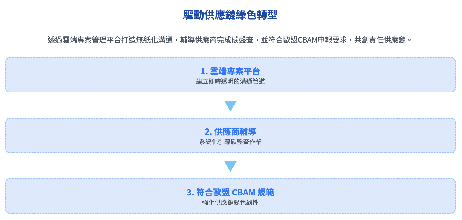 身為台灣製造業轉型的關鍵推手,鼎碩創新採用雲端專案管理平台,強調與客戶及供應商之間即時、透明化的溝通。同時為應對全球供應鏈的永續製造挑戰,積極輔導供應商進行碳盤查,確保其產品符合歐盟碳邊境調整機制(CBAM)的申報要求,藉此強化供應鏈的綠色韌性,並與上下游夥伴共同實踐責任採購目標。