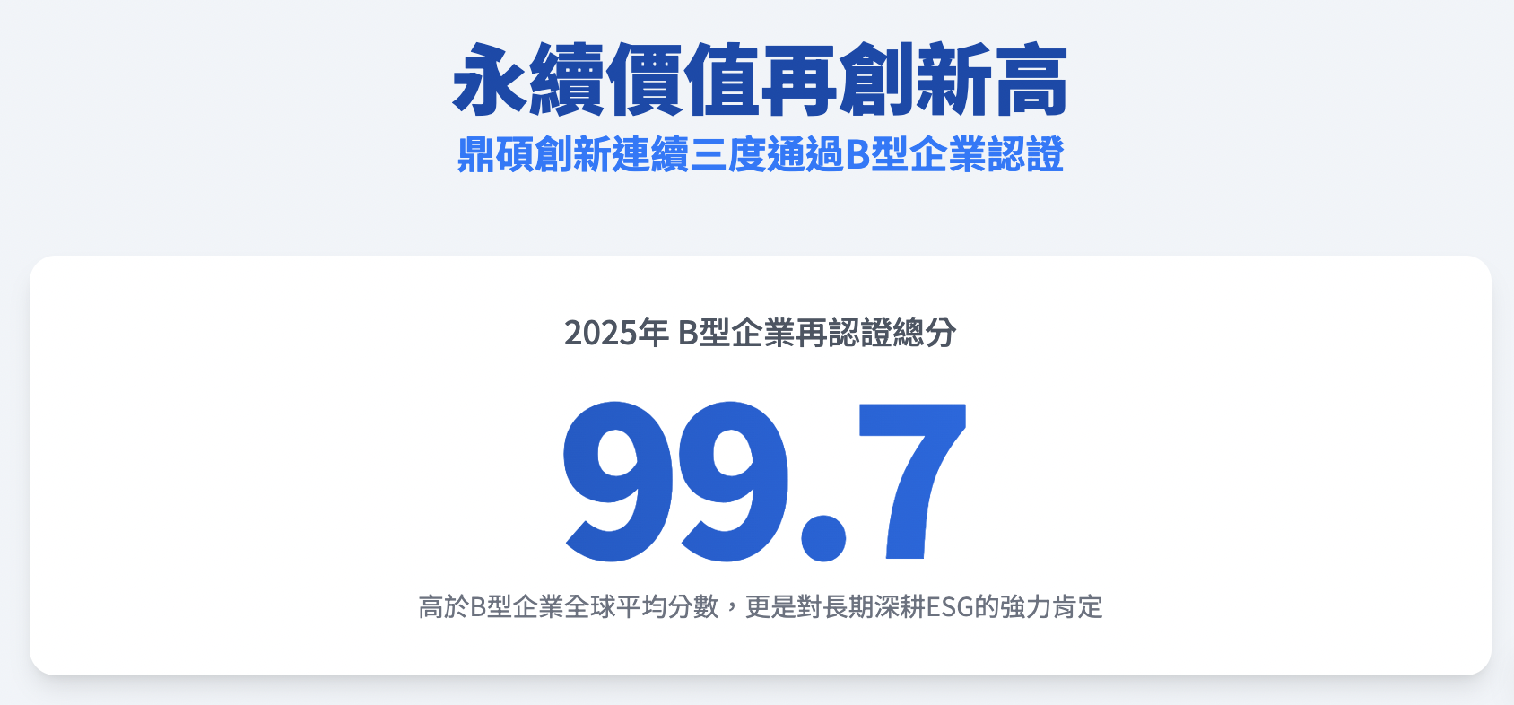 鼎碩創新正式宣佈第三度通過國際B型企業(B Corporations®)認證,成為台灣少數連續三次獲得此殊榮的企業之一。此次認證總分達99.7分,較2022年的93.5分大幅提升6.0分(提升6.4%),不僅遠超全球B型企業平均分數95分,更創下獲獎歷史新高,彰顯鼎碩在ESG實踐與永續創新領域的卓越表現。