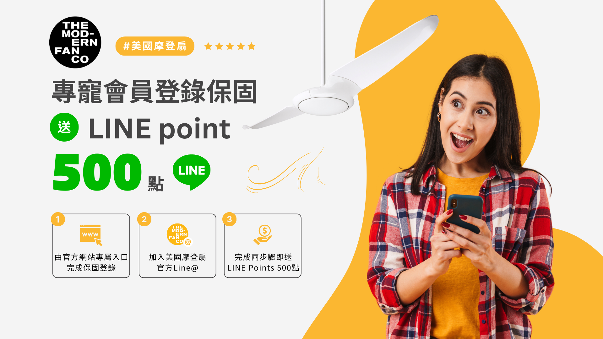 現在,即日起至12月底之間於所有線上和線下通路購買美國摩登扇的主要商品,只需於官網登錄保固,就能獲得 Line Point 500點 的驚喜回饋!